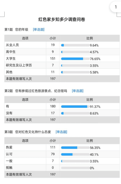 畅游红色故土,饱览大好河山。活动伊始,线上志愿者们将问卷分享到朋友圈、QQ空间等社交平台大力宣传,线下走访答题相结合的方式邀请市民参与调研问卷的填写,并在填写问卷完毕之后向参与群众讲红色旅游景点相关故事及意义,并号召所有人为保护红色文化献力。通过志愿者们的共同努力,共收回197份有效问卷。经调查数据显示,有91%的被调查者曾参观过红色景点,8%被调查者未有参观史,这一现象表明,更多的年轻人重视红色旅游文化。同时,有45%的被调查者了解并清楚家乡附近红色旅游景点,不清楚者则高达55%,说明大学生对于周围的景点以及基地了解不彻底,有待提高。随后,志愿者们通过分析得出结论:应当让更多的大学生了解到红色文化的重要性,使之明确弘扬红色精神是每个中国青年的责任;同时,对待传统文化应取其精华,去其糟粕,紧追时代潮流,结合发展实际。活动结束后,赵喆同学表示,只有深入问题,才能发现问题,在这次问卷调查中,确实发现了一些问题,比如大学生对于红色文化的认识不够、并不看重红色文化等。