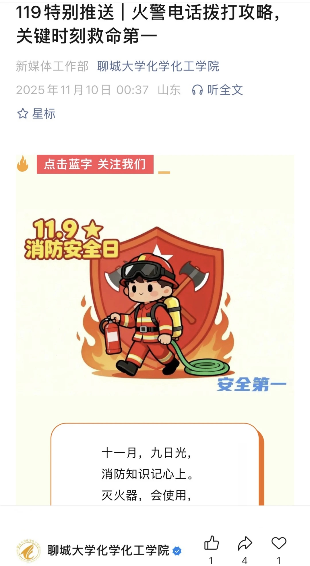 为深入贯彻落实消防安全工作相关要求,增强学生的消防安全意识、提升应急避险与自救互救能力,全面筑牢校园安全防线,聊城大学化学化工学院于2025年11月开展“筑牢安全防线,共护平安校园”消防安全月系列活动。