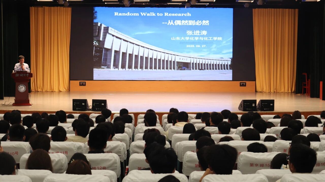 为帮助2025级新生明晰成长方向、涵养科学精神、顺利开启大学新征程,9月27日,由聊城大学学生工作处主办、化学化工学院承办的第153期羡林大讲堂在西校区科学会堂举行。本次活动特邀山东大学化学与化工学院副院长、博士生导师、聊城大学化学化工学院2005届优秀校友张进涛担任主讲人,化学化工学院党委副书记、副院长段艳林主持活动,化学化工学院副院长李海波、全体辅导员及2025级全体本科生、研究生参加活动。